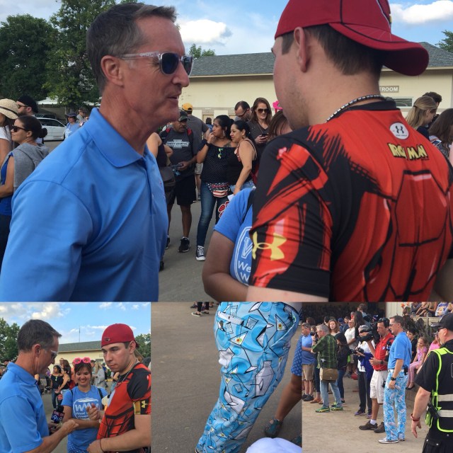 We learned from last year, it is better to sit outside the gates watching them enter, than to be inside, where you can’t get a good picture. As we were there, who should walk up, but Ian Leonard, wearing his Pantini Pants! Channel 9 meteorologist, but better known to this family for his Bad Pants Open! Ian is a huge supporter of Minnesota Special Olympics and the Leonard and Kelsey Families have bonded through their involvement over the years. He stopped to talk and share a moment with Alec and Allie until his camera man summoned him with a job to do, covering the Llama show!