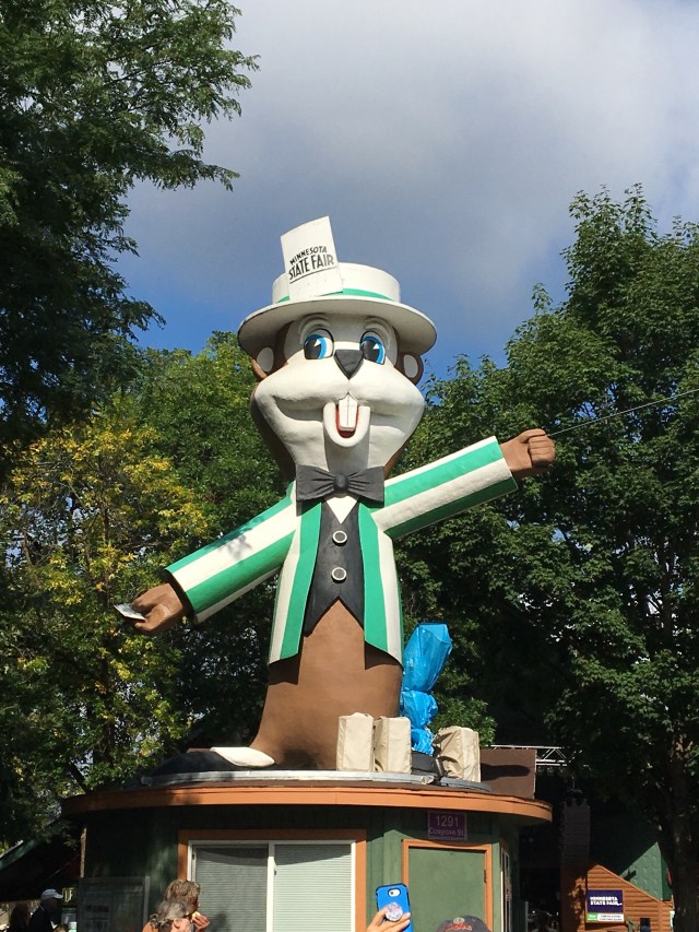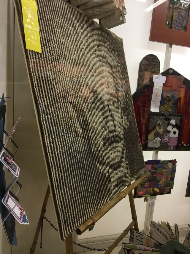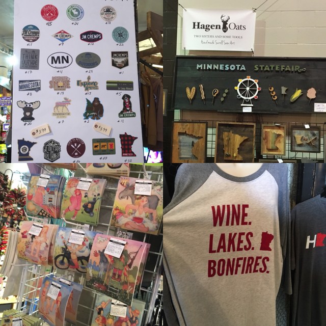 We decided to check out the Grandstand, so we walked up the ramp ( my suggestion as I wasn’t sure how well I’d navigate the steps…) and we wandered looking at all the booths that seem to be the same. There are some old standby vendors, the cooler guys, the extension cords, the Spectacle shoppe and others, but there are a bunch of new “Minnesota” vendors that, to me, seemed to have all the same merchandise, just marketed differently.