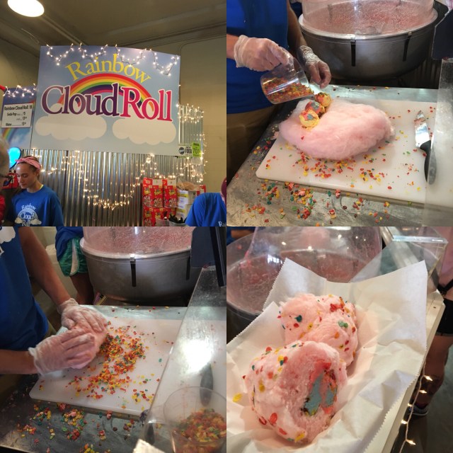 The aisle getting past the “Speakeasy” food vendor up there is too tight so we went around and found the Rainbow Cloud Roll. A new, ultra sweet, child’s dream concoction this year! Our teeth hurt watching them make it. ( Mine especially!)