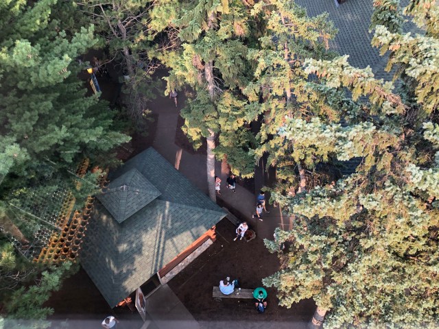 The end game was food at Dino’s for Mark, and he was in the slowest moving part of the group, so Andrea & I found Kim and we started walking up to Dino’s. We stopped for a rest on a log behind the DNR and Andrea took a moment to climb the ranger tower! There was no way, after all the standing around and knee tortured stops and starts today I could make it, so she took a couple of pictures for me and of me!