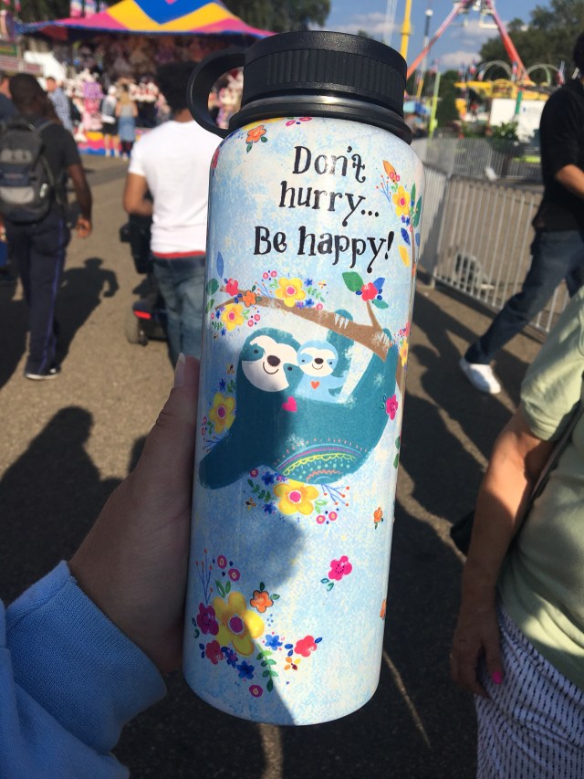 Allie showed me the cute water bottle she found in the Grandstand earlier She did not know the Sloth was our family mascot! And this has a very good reminder message for me today!!!