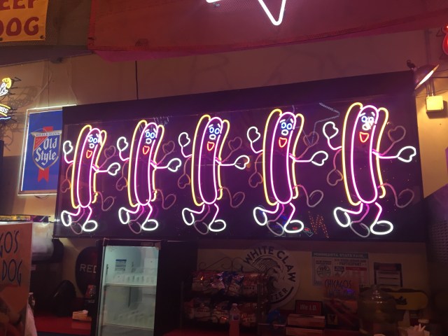 Somebody was smoking clove and this beer maid cut out reminded me of Halloween 1984. I love this dancing hot dog neon too.