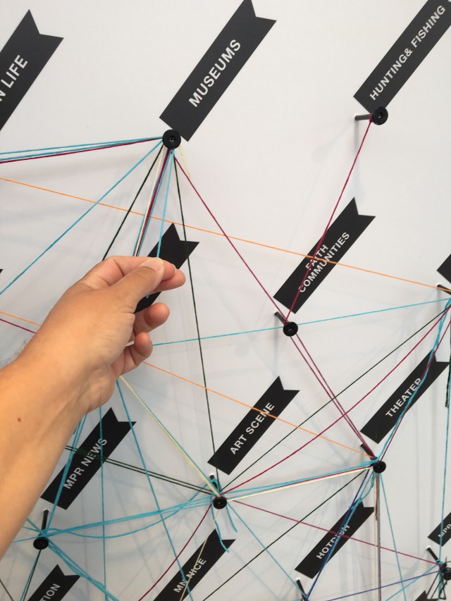 and an installation of colored strings representing regions of MN and by winding it around pegs representing the activities and things that are important to us, the overall art will show how much we are all the same, no matter where we are from.