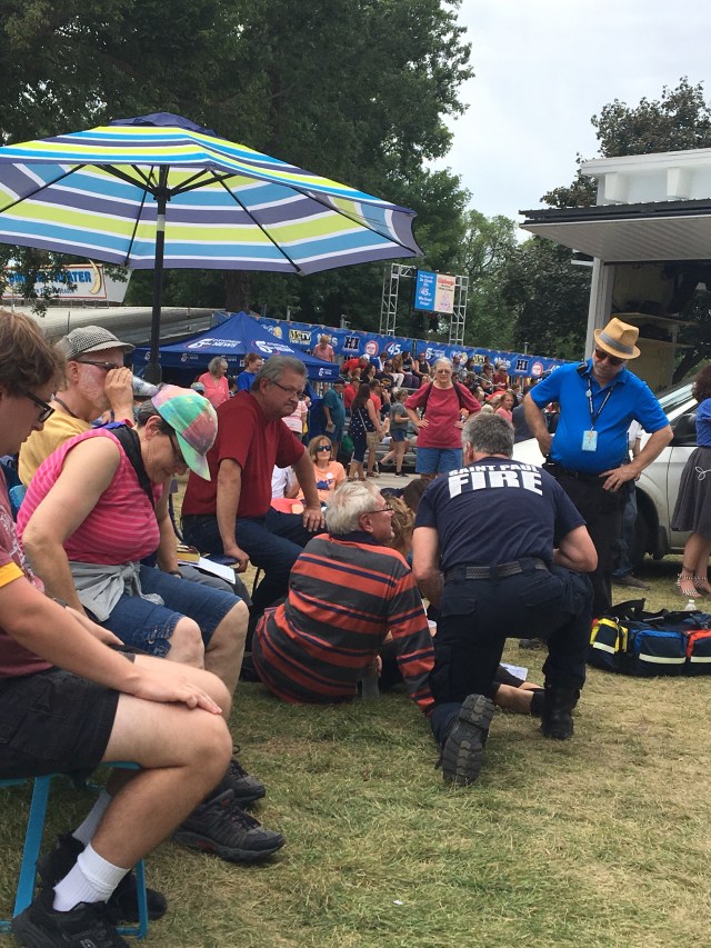 As the concert came to a close, a lady on a nearby bench collapsed to the ground. A man got up to aide, assuming he was a doctor & emergency services were on site pretty rapidly. Luckily she was helped onto the EMT cart, but using her own power. Thanks to all the local firefighters and police so volunteer their time out here!