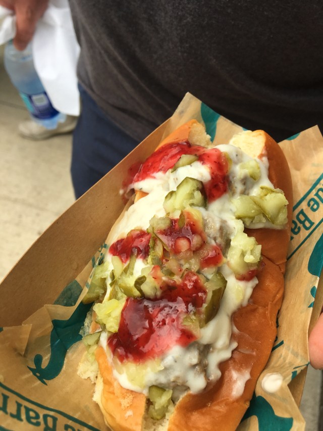 Mike needed one more food, a bit more filling, before heading to work for a busy Labor Day weekend in the furniture business! He got himself a Bratwurst.