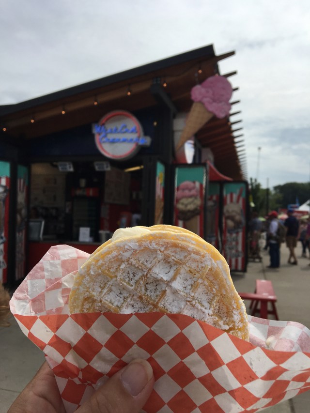 The hot waffles, as always are delicious, this year they were back to the nice thick square waffles. Last year it’s possible they ran out and substituted round Eggo Waffles! My only issue with this food is the powdered sugar cloud you end wearing when you’re done. I thought of Dad in that moment, and how he always wished he had a white “powdered sugar” colored suit to wear to Cafe Du Monde in New Orleans.