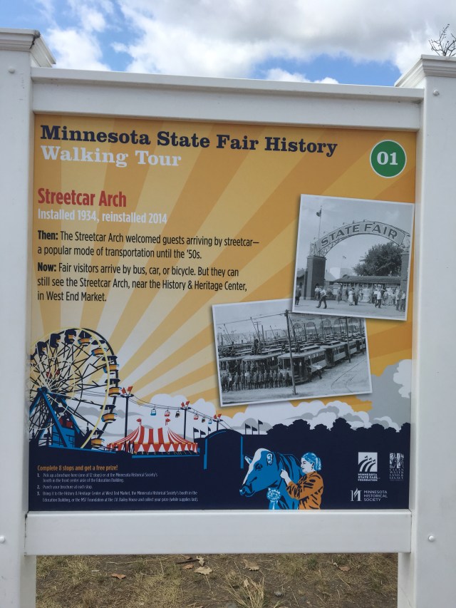 The Streetcar Arch used to be where the DNR is now and welcomed people into the gates at the end of the Grandstand ramp. When cleaning out some property the fair owned behind the Channel 23 building on Como, they uncovered this sign. Cleaned & restored, it will be enjoyed for years to come!