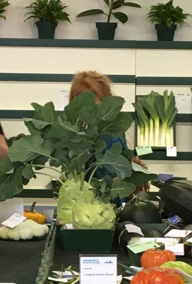 I knew I wanted to see the Gladiola show in Ag/Hort so I walked over to get an estimated time that judging would be completed. I was told after noon, so I went to check out some other areas. On day one I took some pictures from outside before the building opened. Today, the door/windows were closed, offering no ventilation and many of the stately vegetables had wilted! This is the pic of the Kohlrabi, before it wilted.