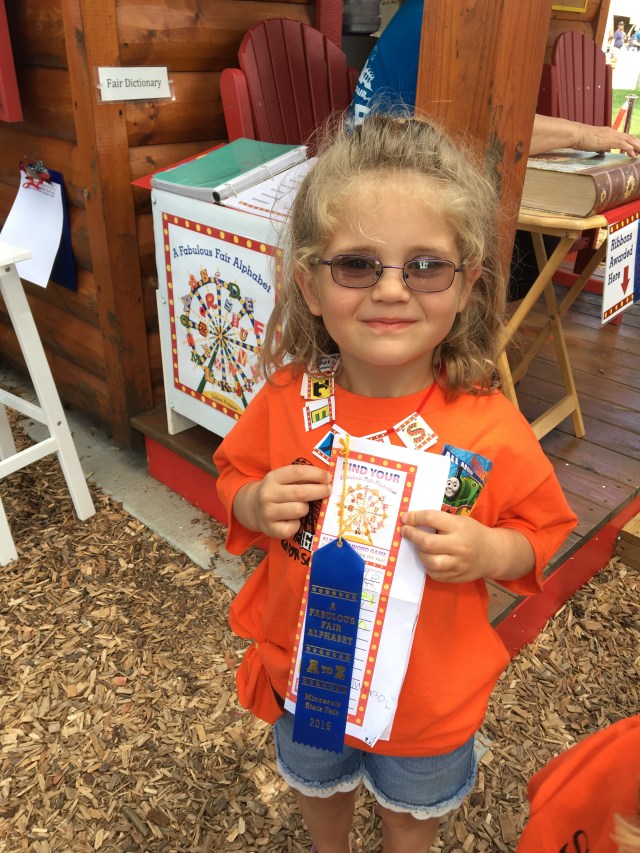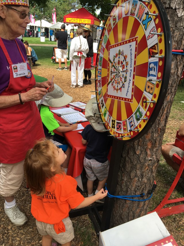 We walked together to the Alphabet Forest, where I love to see the kids explore and have fun with letters & words! Her daughter (A) is just like me, with a driving need to check off lists and finish a task. Kim knew it would take (A) hours in the Forest to complete her game card, so they worked on it at dinner for weeks leading up to the fair! She just needed to fill in a couple blanks to earn her blue ribbon!