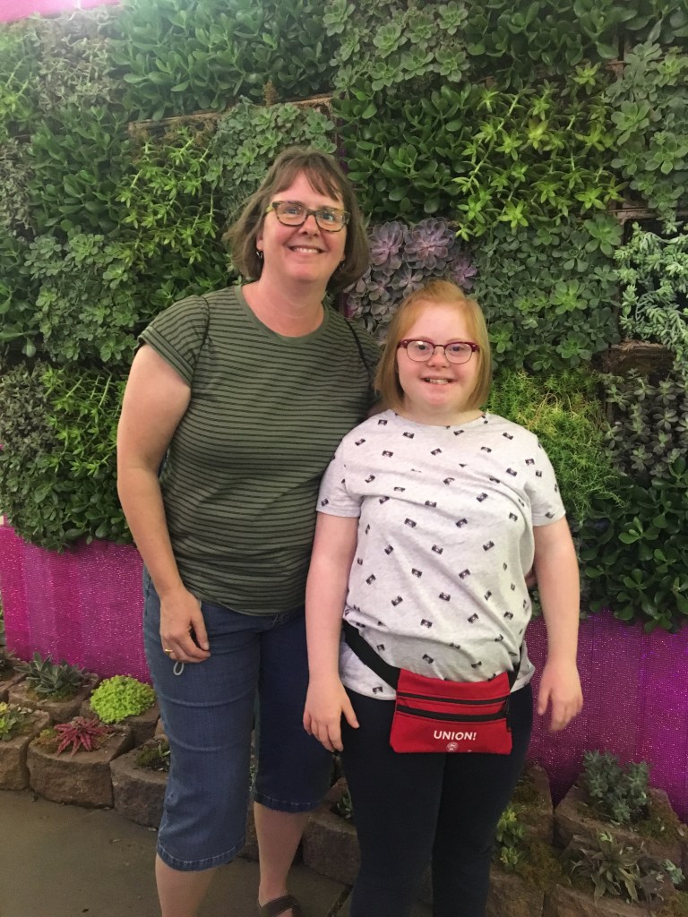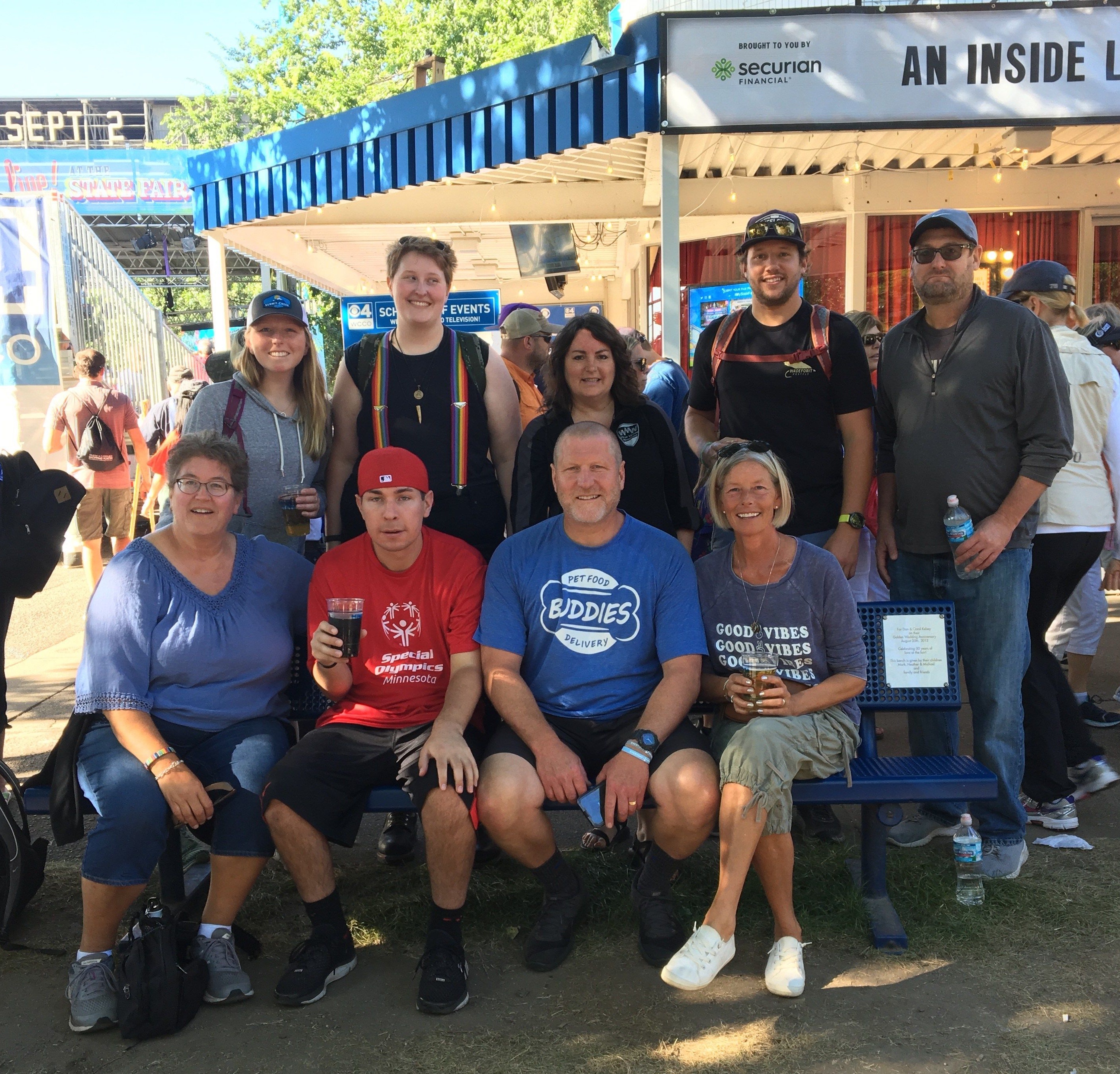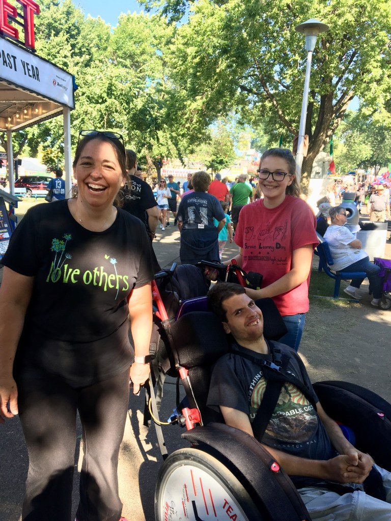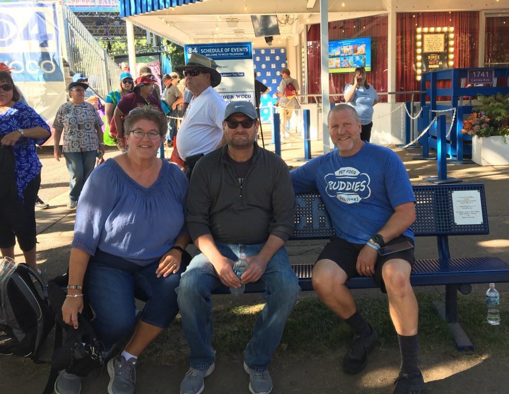 My old childhood friend Kris was braving the fair today with her son Michael and niece Sophia. Our parents had been friends for years through Gloria Dei. They met up with us at Mom & Dad’s bench. Michael’s physical challenges make navigating the Fair, that much more challenging, but you could tell by his vocalizations, vigorous handshakes and smiles that he was really happy to be here!