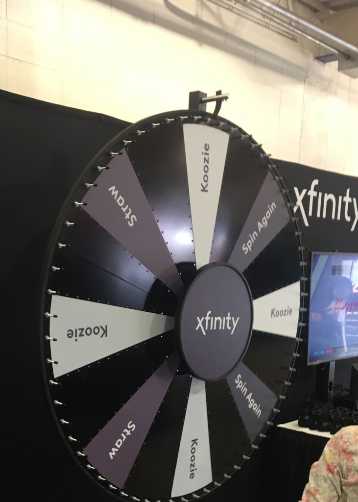 There is a big Xfinity wheel inside fan central, but the line has been long every time I’ve stopped in. Today I had nothing but time, so I waited. I really wanted to win the stainless water bottle. But as I got close, the water bottles ran out and the option was removed from the wheel. I spun and lost, but decided to ask the guys out in the registration tent if I could have a water bottle as a consolation prize for paying them $200 every month? Nope. I wasn’t having much luck in the merchandise giveaways today.