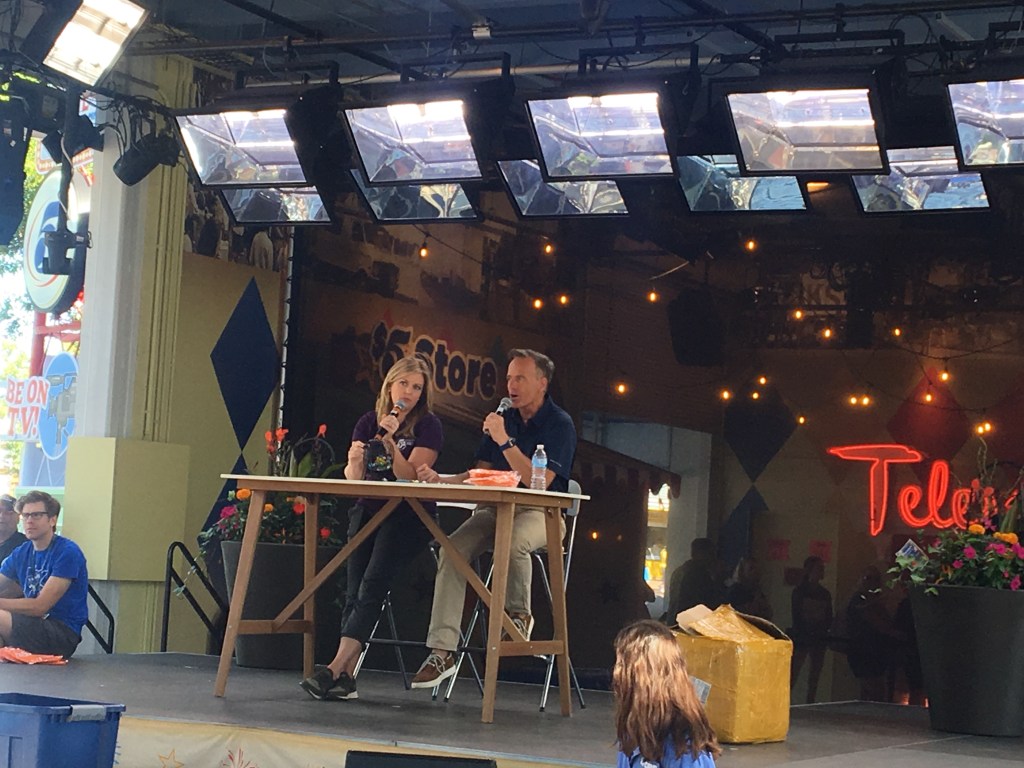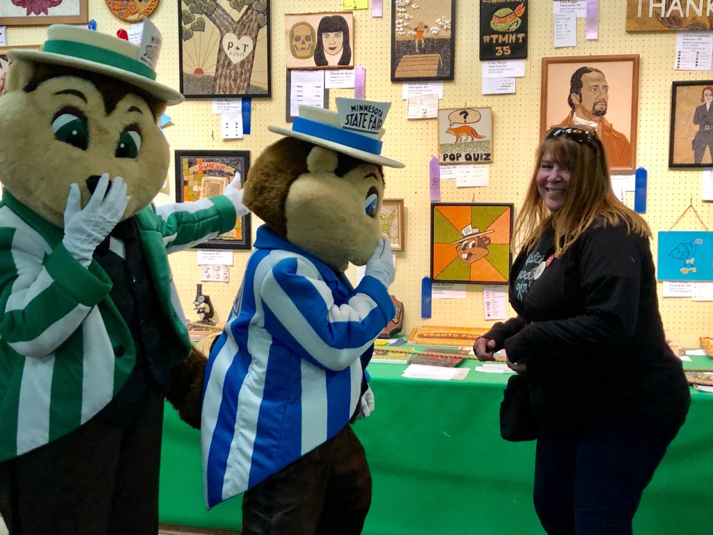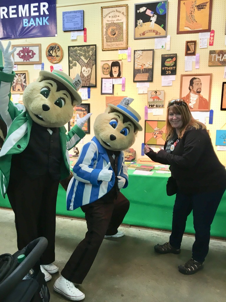 The three of us met up with Gayle at the back entrance to the crop art. This year, crop art became a “must-see” activity and long lines formed every day. The plan we made earlier today with mascot security was to get a picture of her blue ribbon winning piece, along with the mascots! Fairchild & Fairborne were running late, and we were a little concerned that something came up, preventing them from coming. I did try to get some tv news coverage earlier in the day, but the stations I tried were either on air or broadcasting remotely.