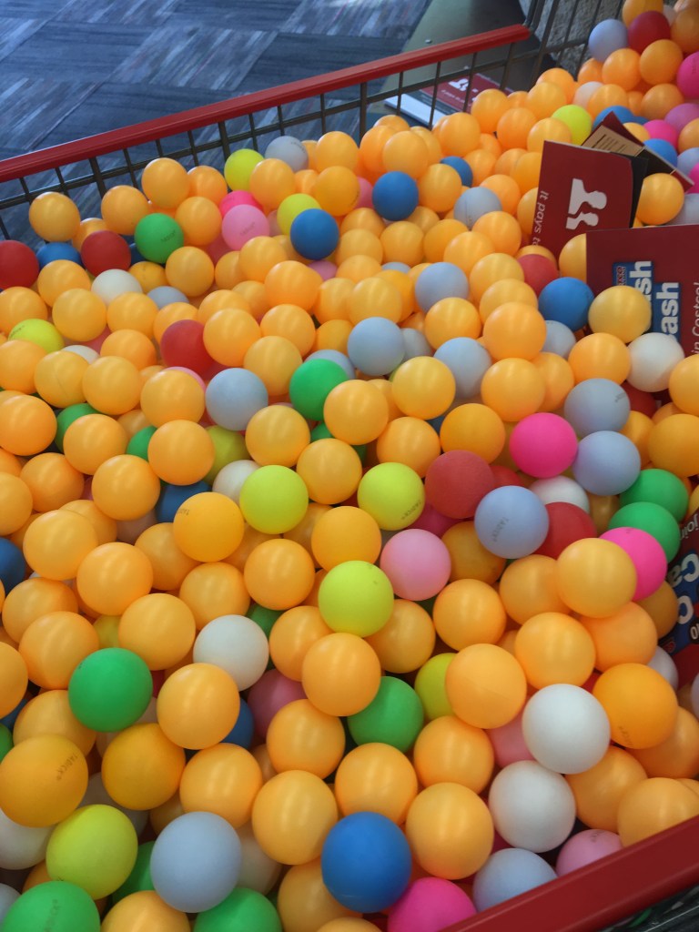 I decided to wander back over to Fan Central to see if I could get a picture with the MNUFC Soccer Loon. On my way, I stopped into the Costco tent. They were offering a really nice cooler, free to new members. My membership expires in August, so I asked if I waited until Sunday, Sept 1st, to renew , would I be eligible? Nope. I don’t know why I took a picture of the basket full of ping pong balls. My eyes were being drawn to bright colors today.