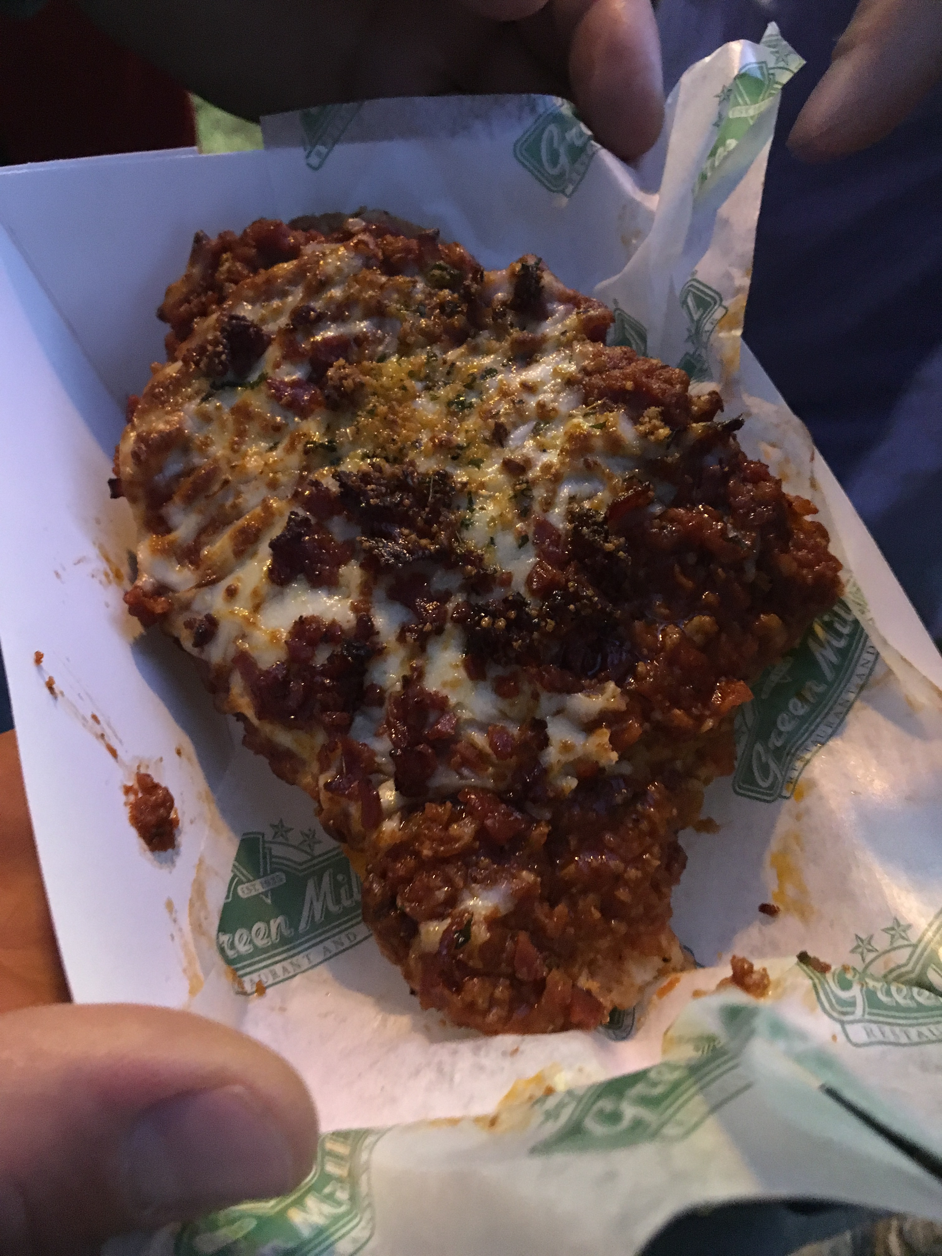 Green Mill was on the left and with this large group, sharing food is a great way to try some of the new stuff! This year the new food “loaded garlic cheese bread” had rave reviews. Not so much sharing went on! It tasted better than it looked at twilight!