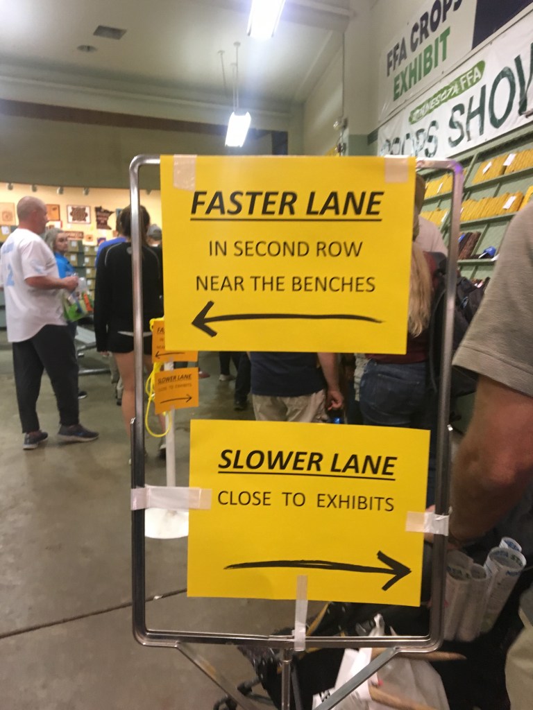 Morgan & Matt found us and they had not seen Gayle’s crop art so we went back to Ag/Hort. I knew the lines had been crazy long and heard rumor that they put up signs. The rumors were true! It was 7pm and the slow line was still out the door! We took the fast lane.
