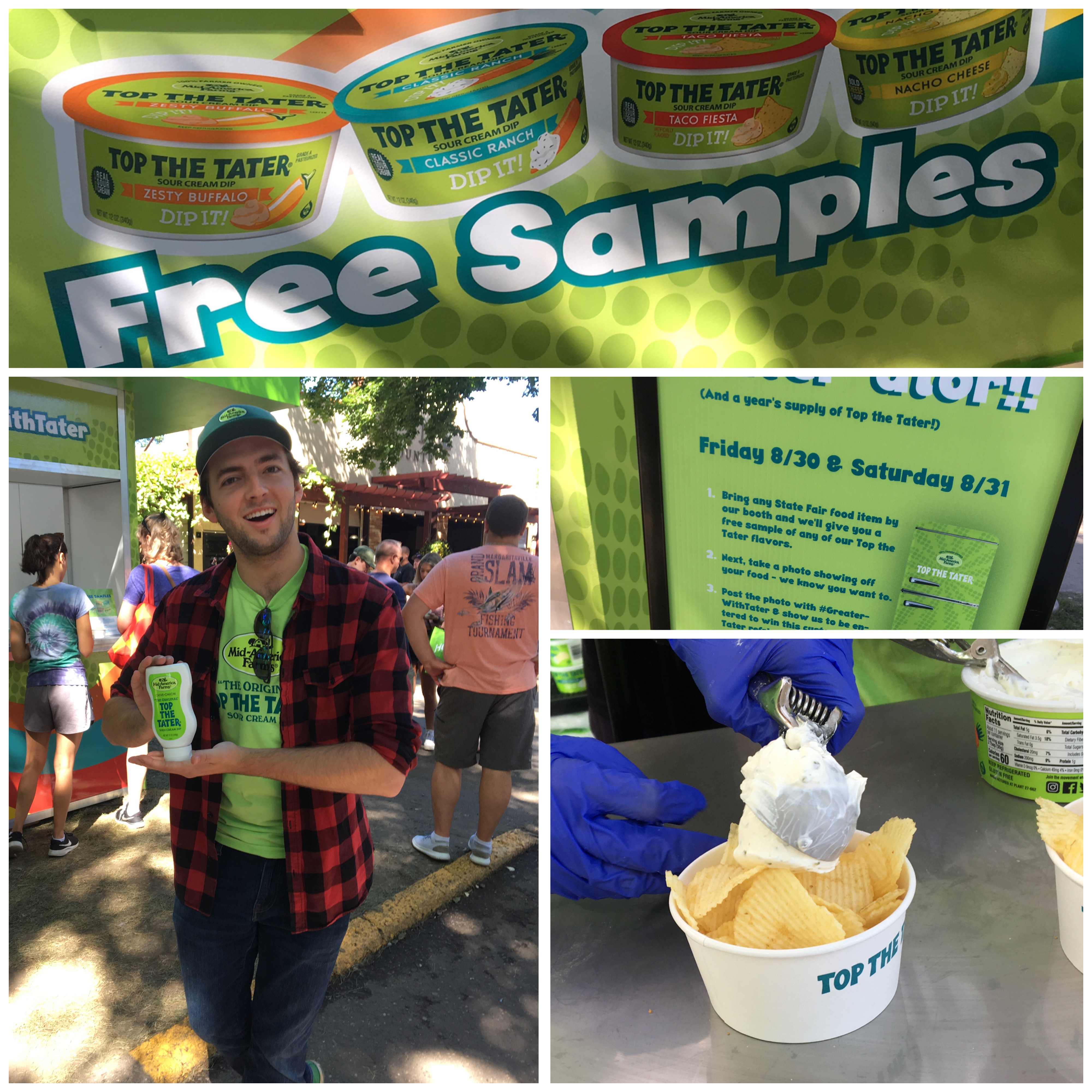 I wandered out of the food plaza and headed down Underwood towards the Territorial Pioneers. Right out in front of the Minnesota Wine Country booth, there was a traveling vendor set up. Top The Tater is delicious addition to any kind of potato! They were giving away sample scoops on a bed of chips. I didn’t know there were different flavors! The guy pictured here informed me that if I brought any fair food to him, he’d cover it in top the tater. They’d only be here today & tomorrow, so I had a plan to get back with a tub of fries!
