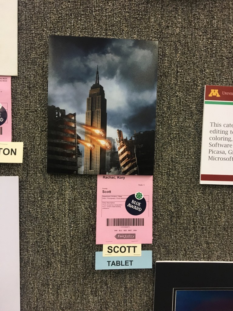 I wanted to find my cousin Kory’s photography exhibit in the 4H building so I walked up the hill to check it out. The category was photoshop manipulation. It was a really cool image! It won a Blue Award!