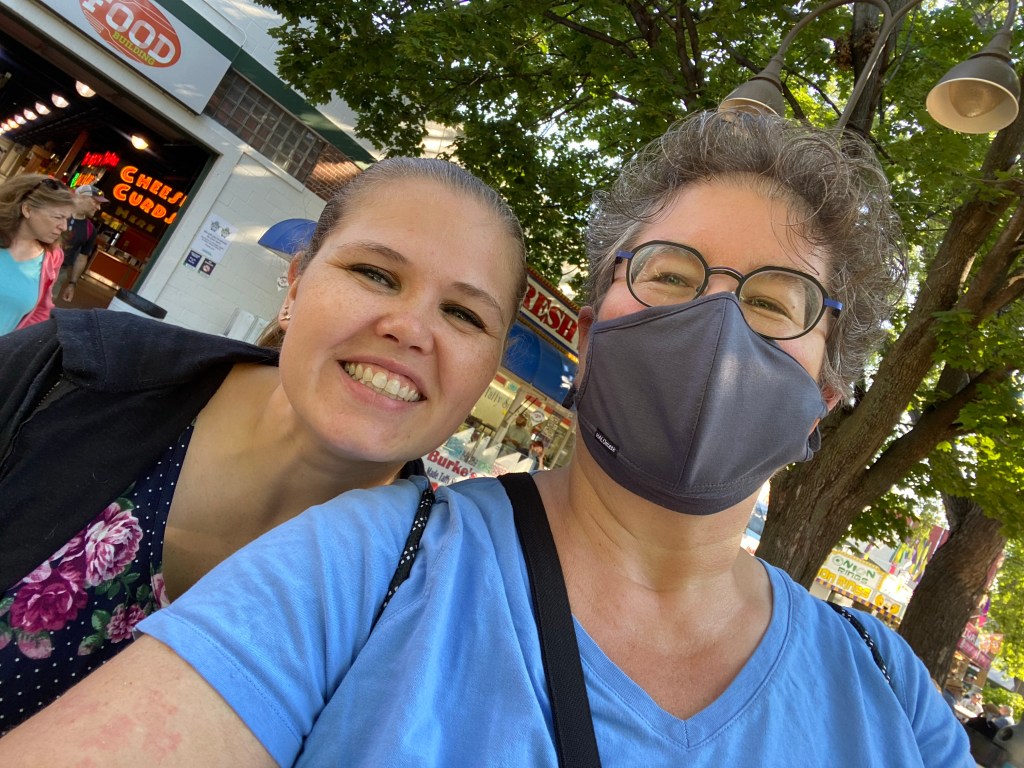 The Bazaar looked rather crowded. I say that, using the word “crowded” defined as “more people than I want to stand around with” and if I need to wear my mask amongst them outdoors. The fair is ~not~ crowded in the usual sense. We decided we could hear them just fine, sitting on a lovely bench on the hill outside Ag/Hort.