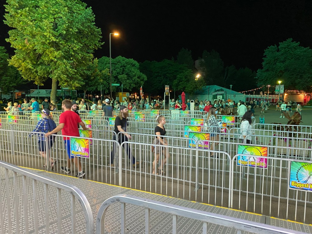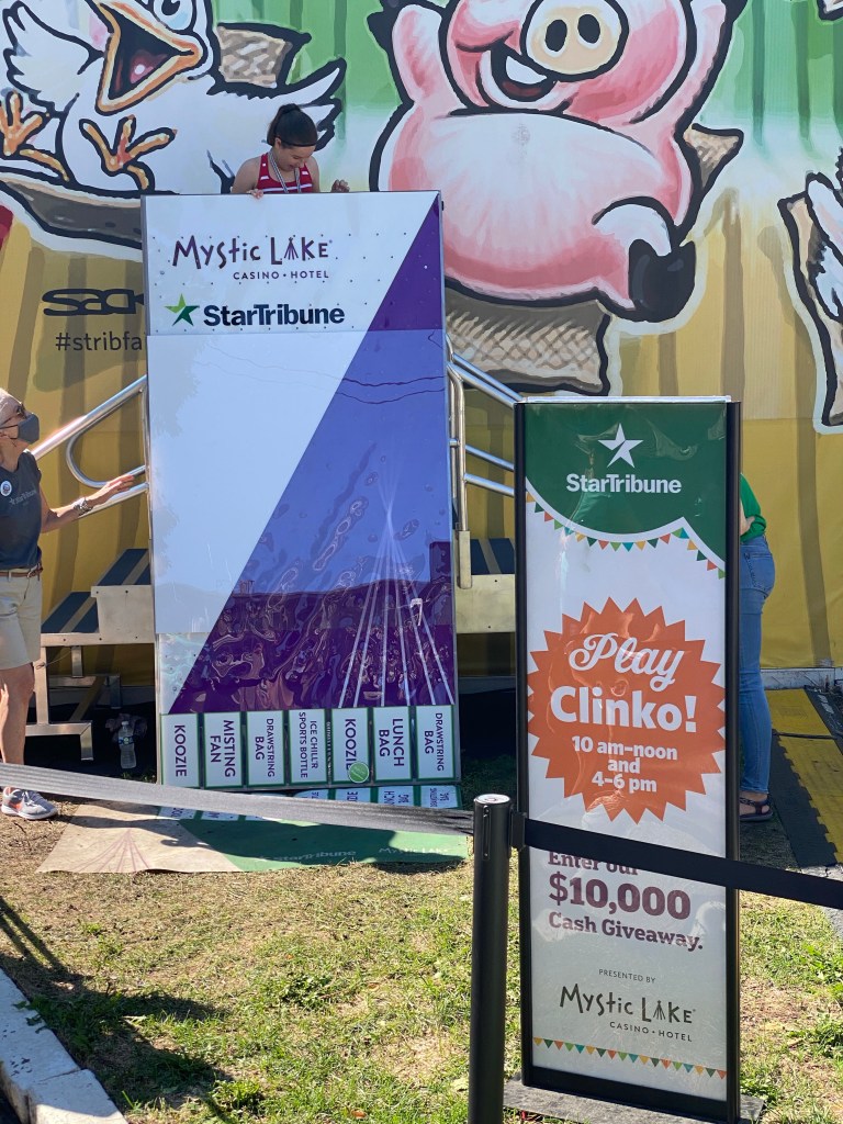 I looked up the grandstand ramp to see if I dared make my way up and into the building, but all I saw was a line. A line for what? I did not know. I got in the line and learned it was a Mystic Lake “Clinko” giveaway. I would have liked any of the prizes except the koozie or drawstring bag…I won the bag.