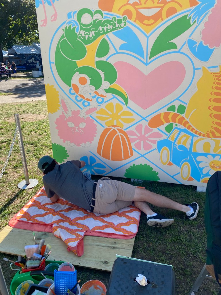 Liz had not seen the art installations, so we wandered that way and found the same artist from this morning, in the exact same position! This time however he was signing his work that was now complete!