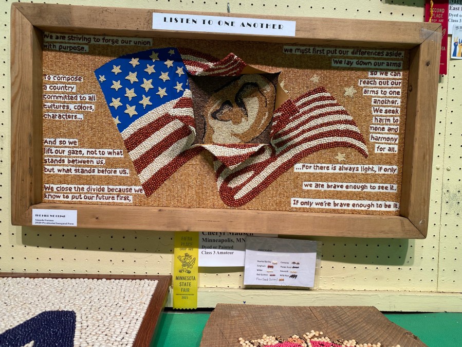 It’s an excerpt from the poem Amanda Gorman wrote and recited at the inauguration “The Hill We Climb”. It took Jack, who overheard someone else talking about it, to see that it’s an ear inside the flag. The title of the work is “Listen to One Another”.