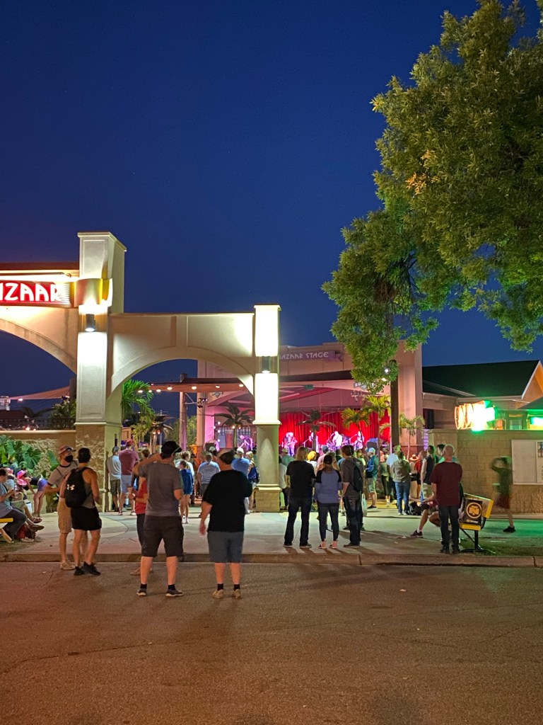 Due to a change in line up and Doobie Brothers member Michael MacDonald backing out (he was being tested for a breakthrough Covid case), the Grandstand concert would be starting and ending earlier tonight. I thought it would be a good night to stay and see fireworks and a possible corn dance. Our small group decided to return to see the Eagles Tribute Band once again and pulled up a bench outside the bazaar.