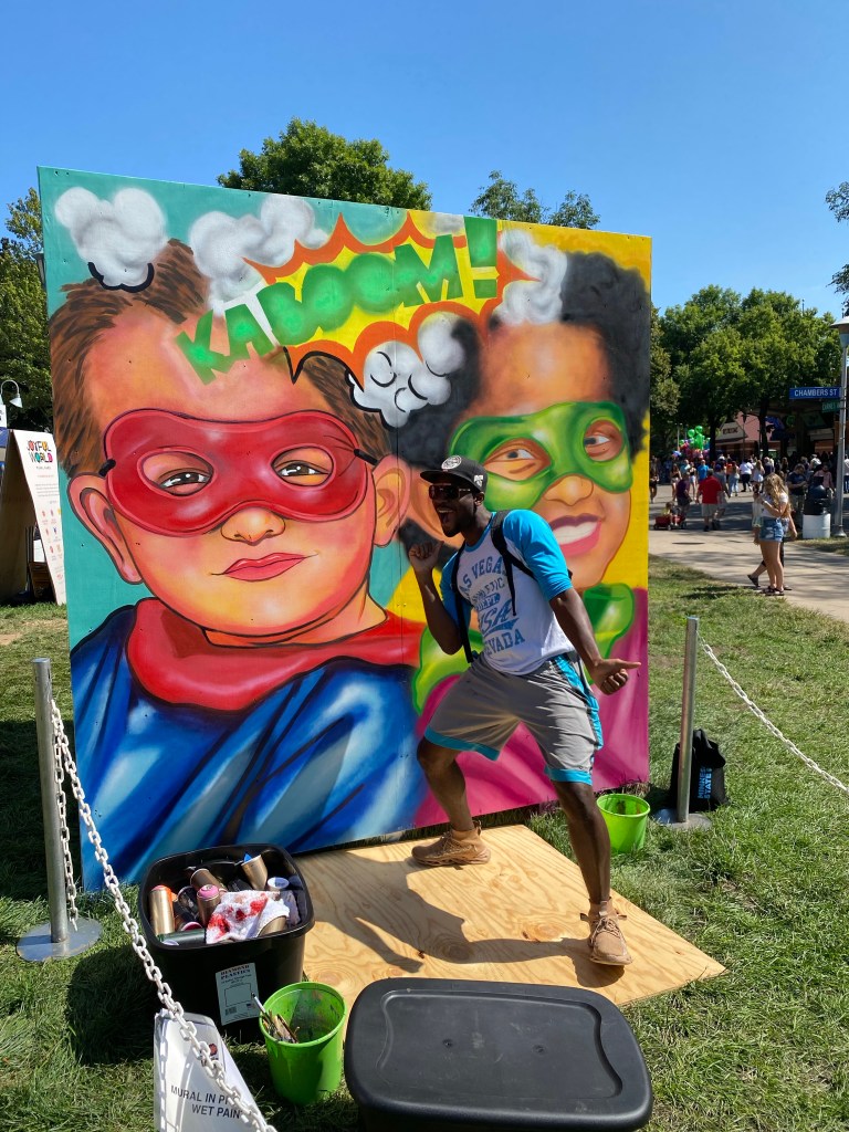 After the parade, we had no agenda and decided to share a burrito from El Sol, the taco place right behind the bench. They’re just OK, nothing fancy. Jack wasn’t a fan of the cilantro. We said goodbye to Grammie and went to find something sweet. On the way, I found more artists at work.