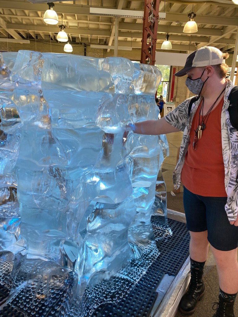 We needed to fill water bottles, so we went back into the Eco Building. Very few people inside makes it easy to check everything out. This was the first time I noticed the huge melting ice blocks in the center. Last time I was too focused on the scavenger hunt.