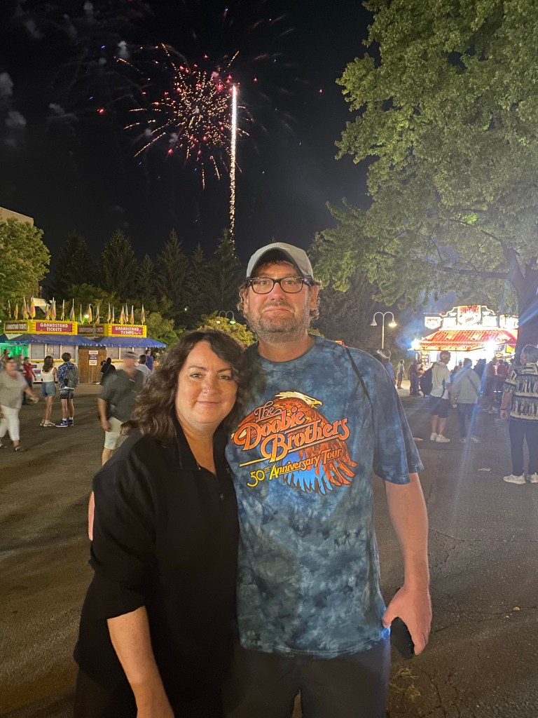 Mike texted that the Doobies were playing the last encore, so we walked back…again….to the grandstand. The fireworks shot off as Mike & Kathleen found us.