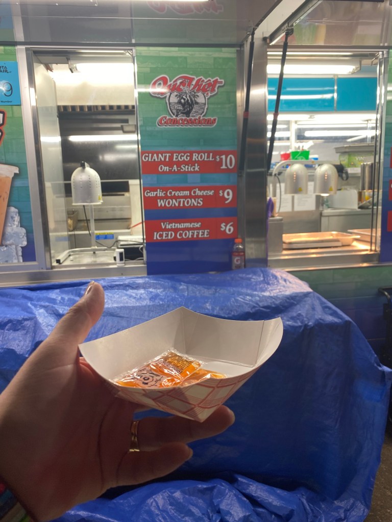We all made our way back up Dan Patch to head home, but Mike was hungry so I stopped at Que Viet for a quick egg roll to share. It was not quick! Mike gave up waiting and moved on to find nachos at OofDa Tacos, but I stayed to wait. It turns out they’d turned off the fryers at 9:30 as they’ve done all the previous slow nights and sold the food remaining. Tonight, however, the Grandstand show let out so early, they experienced a concert rush! The kids were unprepared and did their best! I prepaid and waited with my empty boat for about 20 minutes. The fryers heated back up and the restless crowd got egg rolls & wontons, but I’m pretty sure they’ll keep the fryers hot a bit longer from here on out!