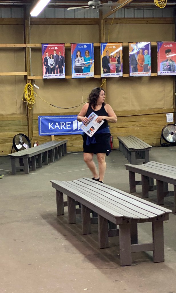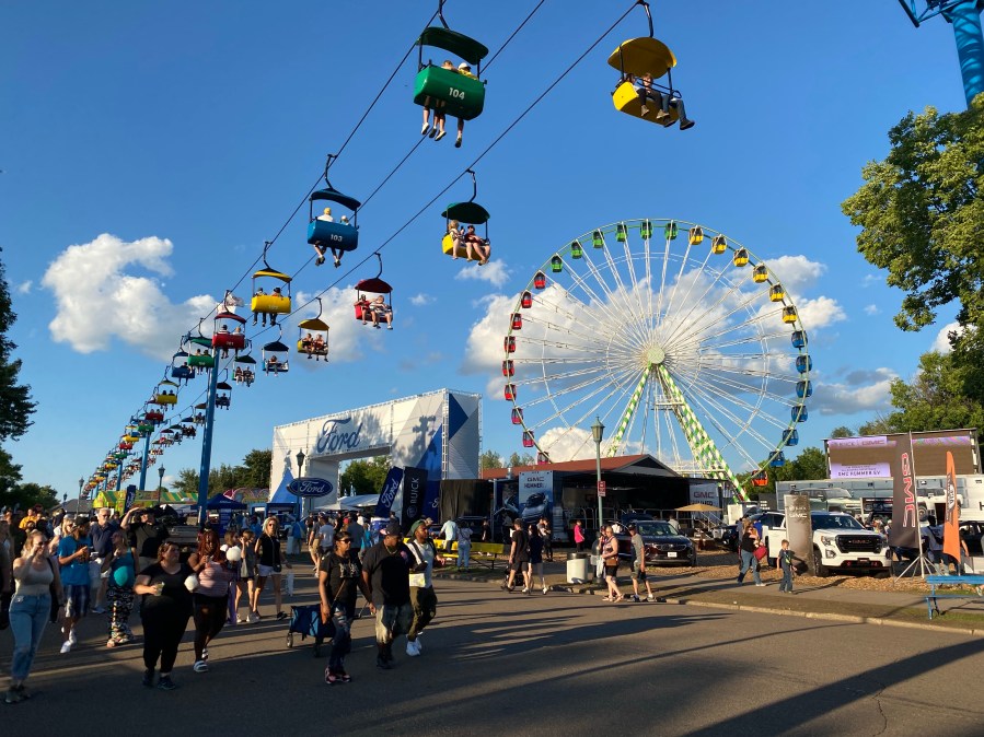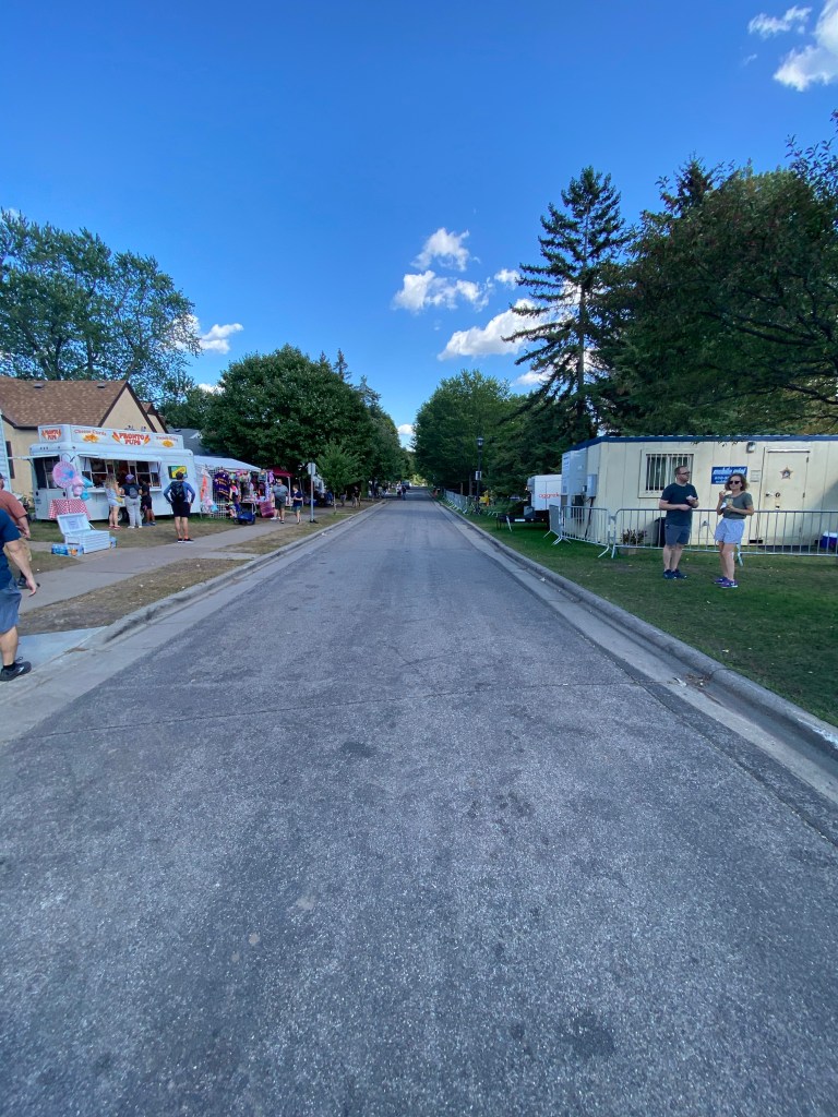 We got back to the fair in time for dinner. The place was crowded. Not record breaking, but felt like a typical busy fair weekday. I just knew it was more people than I wanted to rub elbows with. There a couple roads less traveled, discussed in the blog, that I used to get from East to West every day. Here is a picture of one. It’s not pretty, lined with dumpsters and storage sheds, but it’s also empty of people. Nothing to see here, but it saves walking down Judson, the Fresh French Fry street or Carnes (aka “food alley”) where you have to navigate between Dino’s, Sweet Martha’s, French Meadow and Mancini’s. At the end of this hill, there is cold water at the KareBarn!