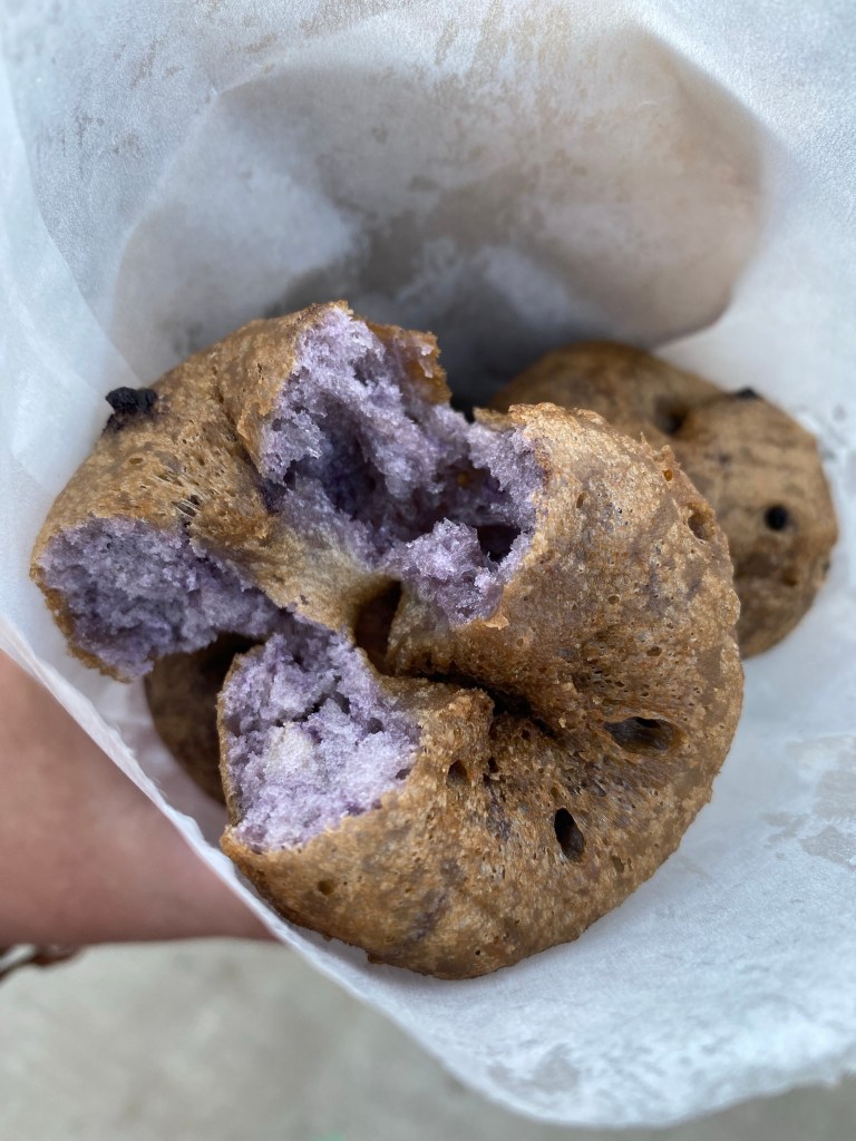 I’d eaten real food for dinner when I left the grounds earlier, and as we hiked north I remembered there were blueberry mini donuts to be found up here! It’s part of a huge concession complex with every fair food you can imaging across from the Home Depot. Everyone working in the booth had some kind of accent. I guessed they might have been Australian, but didn’t ask. Mike suggested we ask for no added sugar, and he was right. They were sweet enough with the berries, and pretty delicious!
