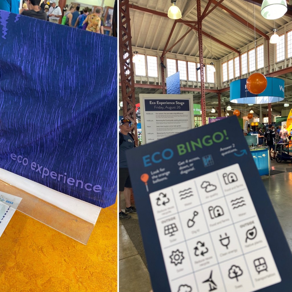 There still is Eco-Bingo this year with a purple cooling buff (neck gaiter) as the prize. To find the BINGO stations just look for the big orange balls in the air. We decided not to play.