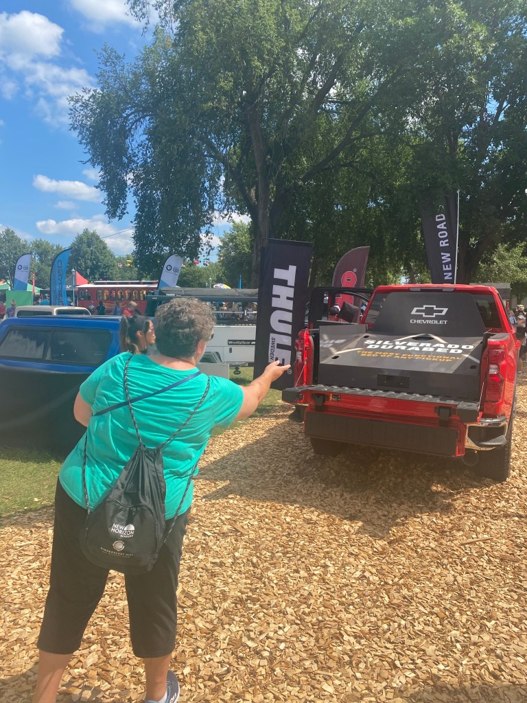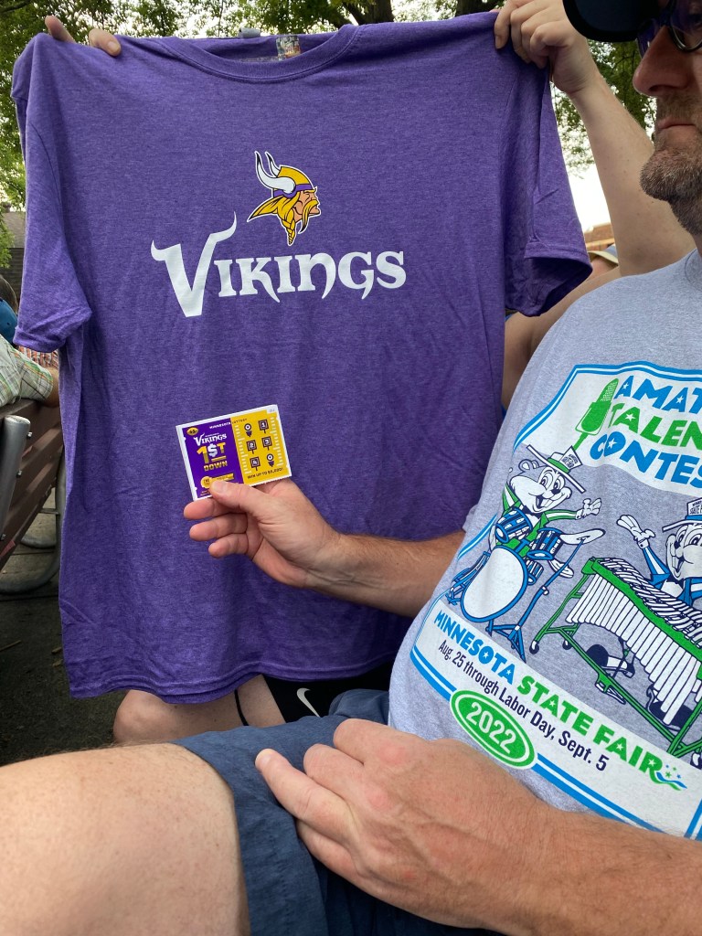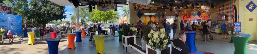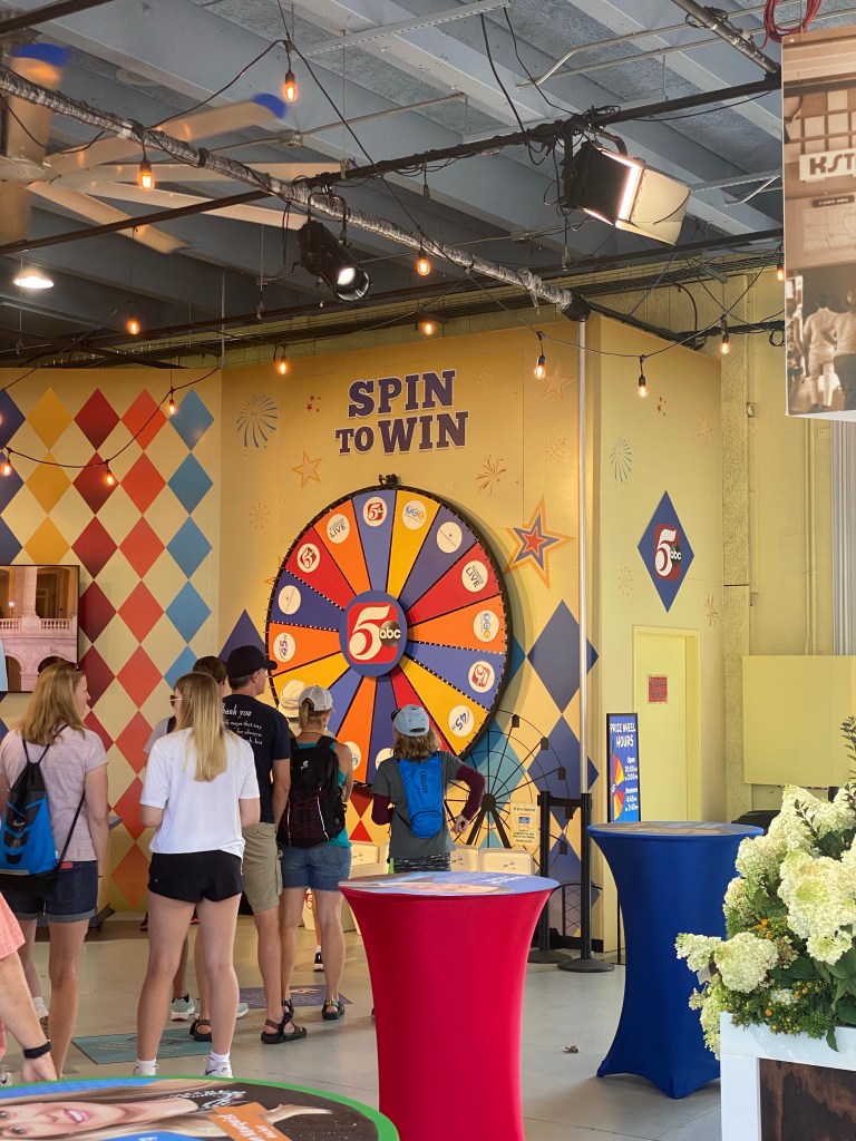 We scooted through the KSTP booth, and the line to spin the giant wheel was all the way down the street. I can say, “never have I ever” spun that wheel.