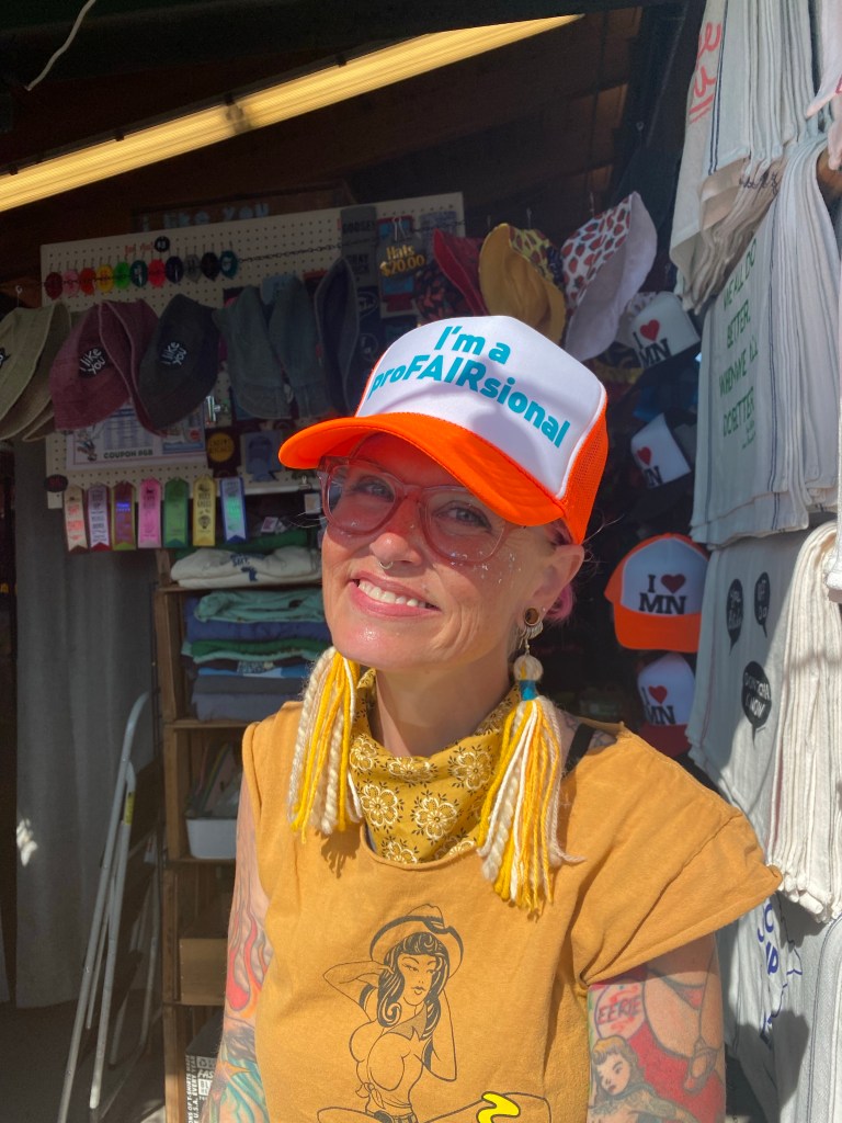 We got to the west end and found Sarah working hard at “i like you”. Her hat! I’ve often referred to myself as a “state fair professional”, but this is much better. if you’re looking for great Tshirt deals, Minnesota swag and hotdish related things, stop by!