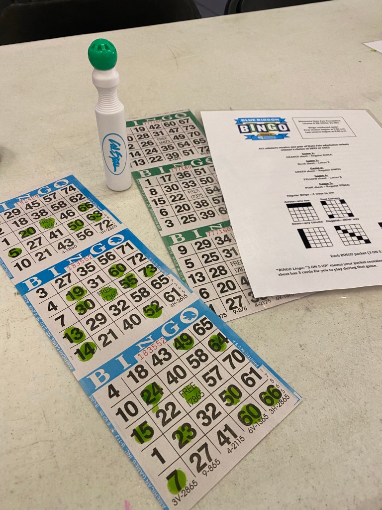 Leaving Ag/Hort I knew we were close to Grammie’s bench, but we got totally distracted by BINGO which was going to start in 10 minutes and there was no line! we paid $10 (donation to the foundation) for our cards and I made Elysia pose in front of the giant blue ribbon.