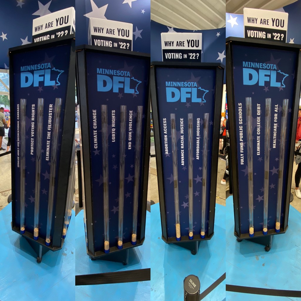 I had a little more time so I went to see what the DFL was up to this year. You can get your picture with the President & V.P. cut outs, there’s lots of new buttons and t-shirts and if you scan a QR code and get on a text list, you can get a bean to vote on why you’re voting. These are all the voting choices, and they’re all very good reasons to vote, but I put my bean in “protecting voting rights”. I figure without voting rights we can’t do anything about all the other things!