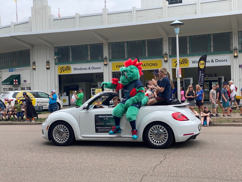 We both walked up Cosgrove, with time to sit and watch the parade. Today a new parade unit is the Aurora Mascot. I’ve never seen it before!