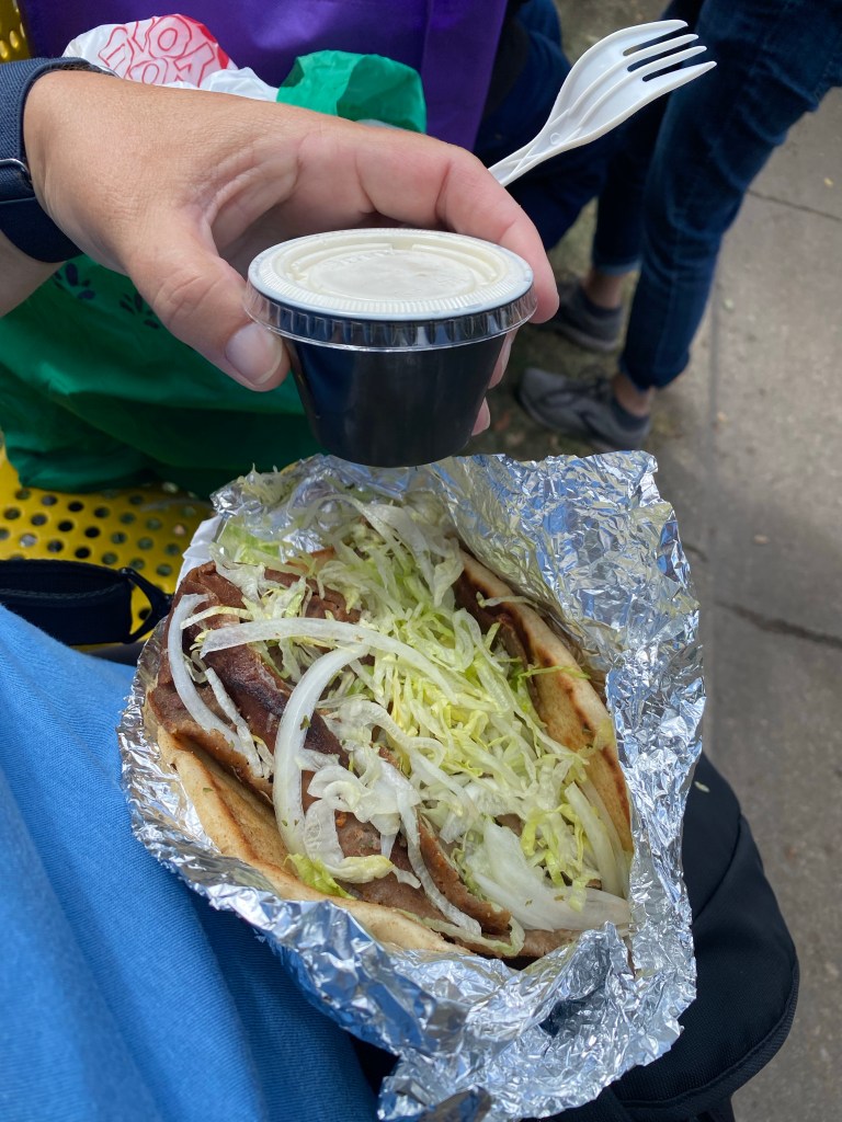 I opened up all the foil and found a hot sandwich and large cup of sauce! It wasn’t as messy and you get lots of tzatziki!