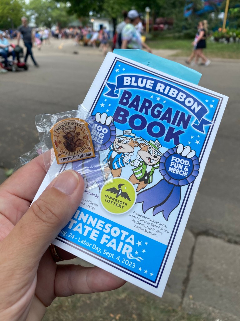 Karla chose a coupon book instead of the annual pin with her Friends of the Fair benefit package. She kinda wanted the pin and asked if I knew how to get one. I happened to have an unused book. (I was gifted a couple by people leaving the fair one day). I said she should see if they’d exchange it at the Bailey House tent (right behind us). Voila!
