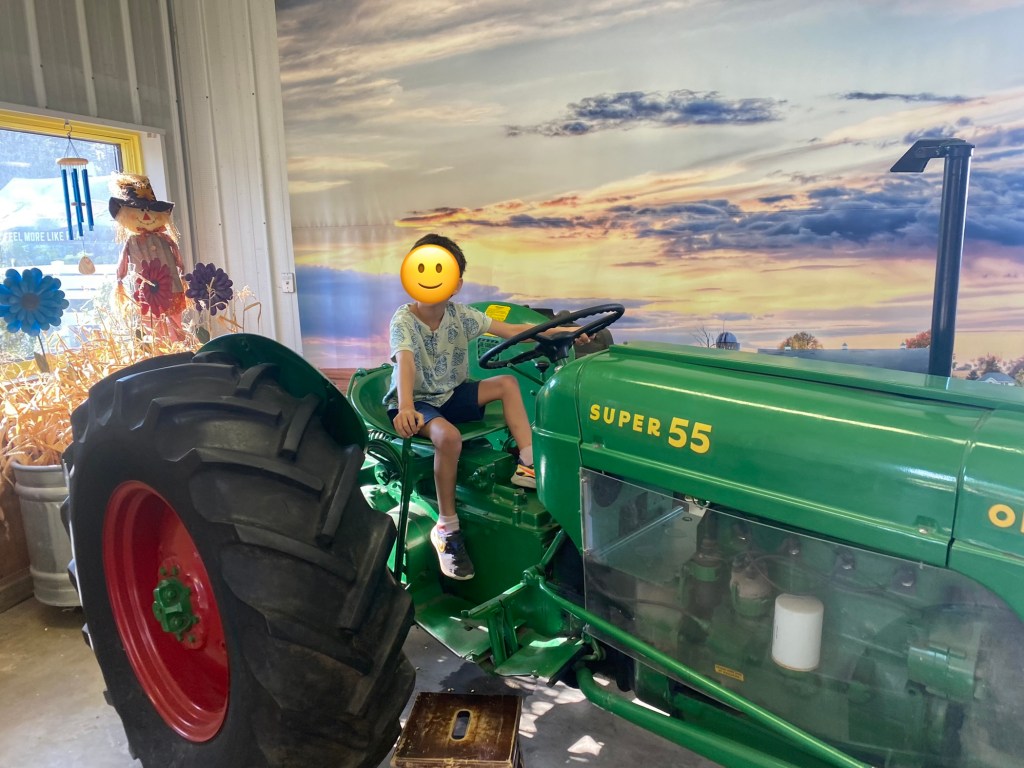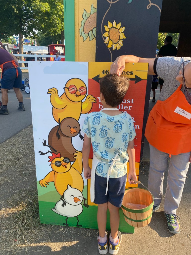 B is just over four chickens tall. The attendant let them ride, but it’ll be the last mini tractor ride for this kid!