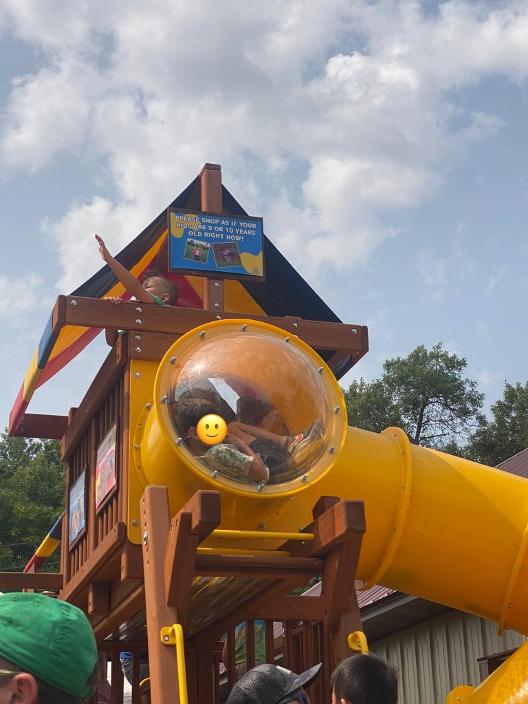 The only things left on our to do list, were to play at Rainbow Play Systems free climber and acquire the promised treat & prize! I can’t imagine how hot it was up inside the bubble! The temp must have been close to 90°.