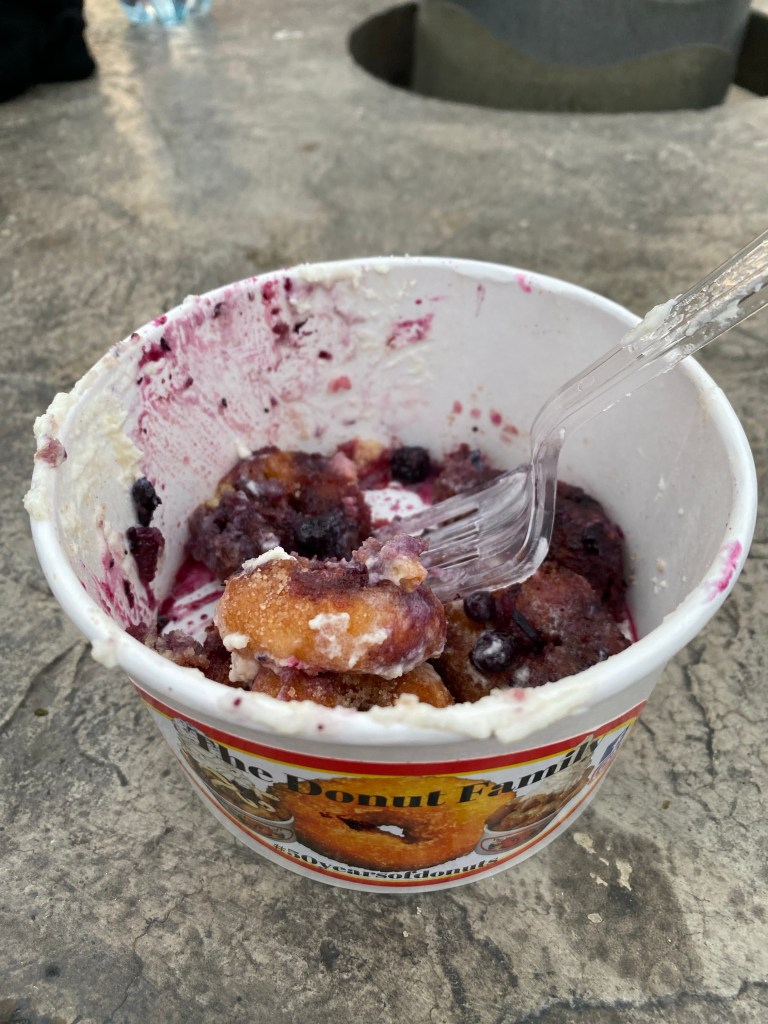 After numerous slow texts trying to triangulate positions with Elysia. I’d say we were one place and by the time she got the text and arrived… we’d be gone. Elysia found us and had a special treat! The Donut Family blueberry compote lemon curd covered mini donuts.