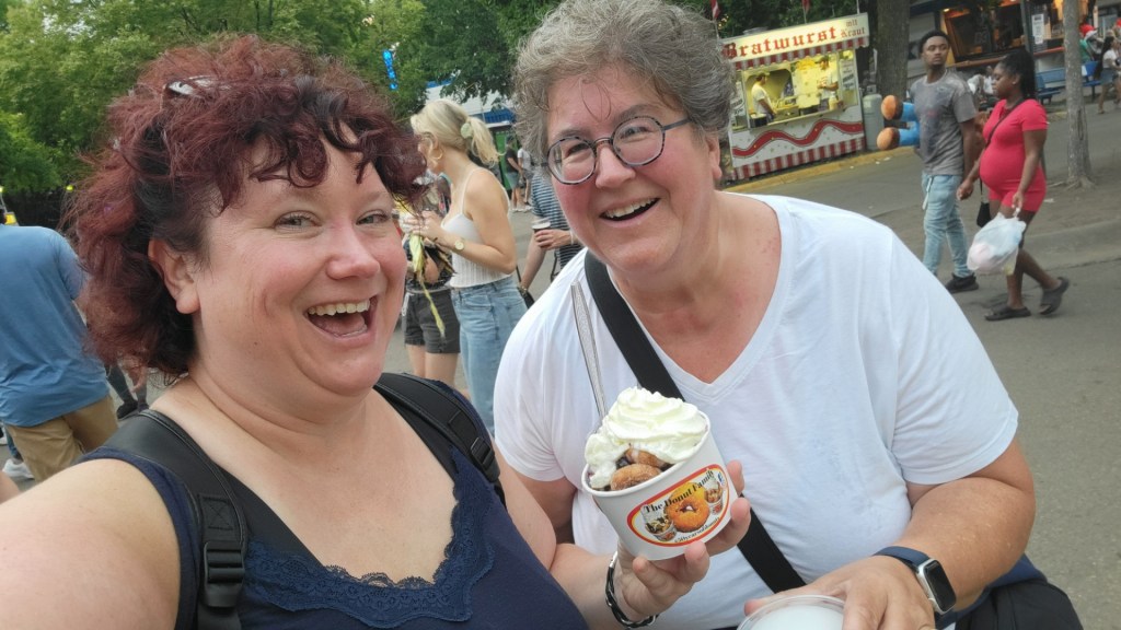 I showered, put lotion all over my sunburn and rested a bit before returning to the fair around 6:30. I watched a little talent show and then connected with Mike, Kathleen and eventually Elysia. I was filling my water bottle and thought the machine wasn’t working. Turns out it was user error and the sensor was seeing through my bottle. Previous times I must have had the logo in the right spot without realizing. A lady waiting and watching me laughed with me when I realized what I was doing wrong.
