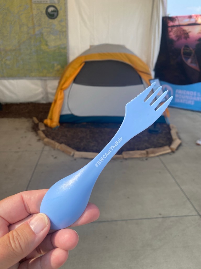 I stopped by the Friends of the BWCA tent and got my camping spork utensil. Can come in handy out here when you want a bite of somebody else’s food!