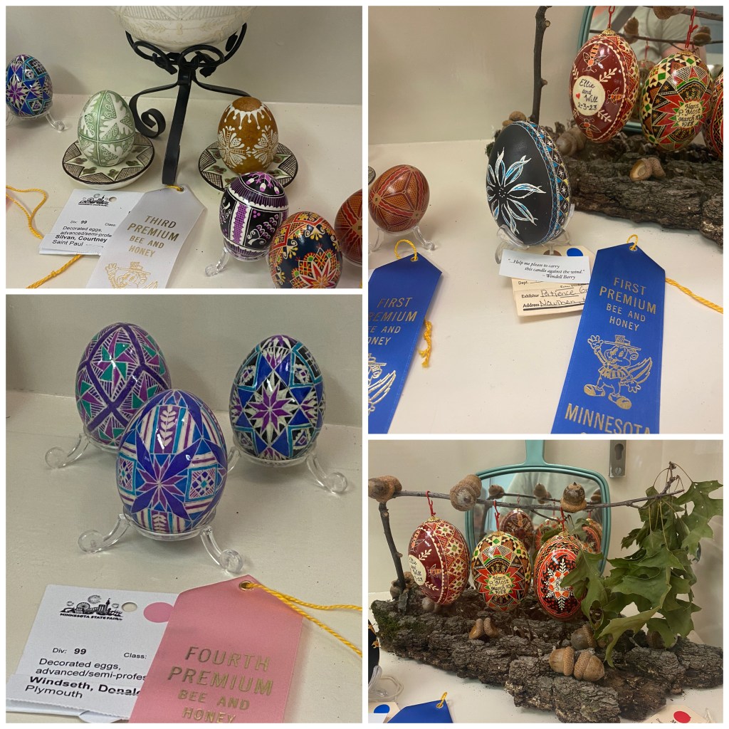 The line for the crop art was far too long. It was winding out the door around the center aisles of the hexagonal building. This would not do. While Nancy and Sara tried unsuccessfully to get in through the back way, I got the entire line to shift so that instead of clogging all the paths around, the line was headed down one aisle and towards the outer door. I wanted to check out the Pysanky eggs in the bee wing, so while they looked at big pumpkins, I found the eggs. There were no novice entries. This could have been my year if I’d gotten my act together! I feel like I could maybe compete.