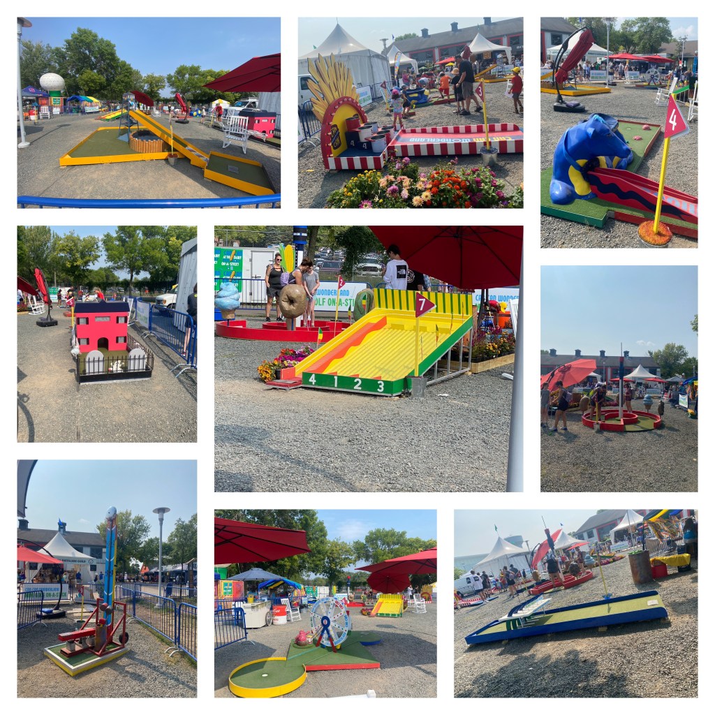 The nine hole course features, a haunted house, gate 5, the giant slide, DNR ranger tower, a cow (including cow pie), a ring the bell with sledgehammer game, Ferris wheel, space tower and French fries booth.