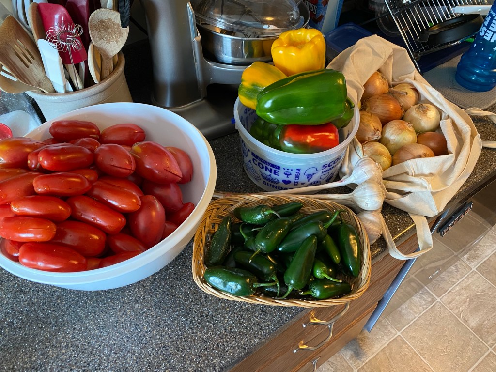 Today there was lots to do around the house. Handyman was returning to install (the correct) garage door, there were piles of laundry and a sink full of dishes. Our handyman, Joe, is from Italy and he asked for tomatoes. They have been ripening on the vine and I’ve been able to ignore them until now.