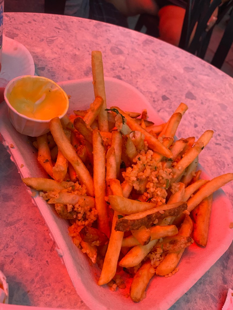 The cream was gonna melt pretty fast, so we decided to see if there was a table at the Ball Park, enjoy a beverage and garlic fries and catch up. We’re chatters, us two! There was a quick detour for margaritas.