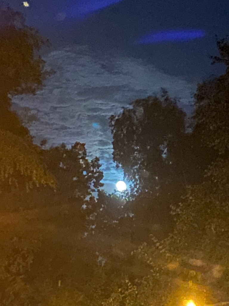We left the fair and after we made plans to go back to the fair together on Monday, I dropped Sally at home and turned the corner to see the moon. Not quite as super as it was, but still a thing to see!